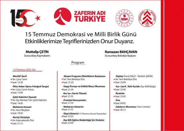 Dursunbey’de 15 Temmuz EtkinlikleriHain darbe girişiminin ardından bu yıl 9. kez gerçekleşecek olan 15 Temmuz Demokrasi Zaferi ve Anma etkinlikleri Dursunbey’de yine dolu dizgin geçecek.