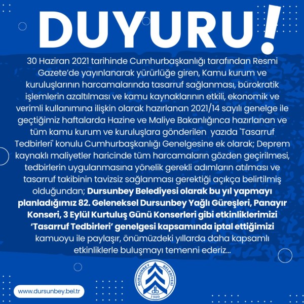 30 Haziran 2021 tarihinde Cumhurbaşkanlığı tarafından Resmi Gazetede yayınlanarak yürürlüğe giren, Kamu kurum ve kuruluşlarının harcamalarında tasarruf sağlanması, bürokratik işlemlerin azaltılması ve kamu kaynaklarının etkili, ekonomik ve verimli kullanımına ilişkin olarak hazırlanan 2021/14 sayılı genelge ile geçtiğimiz haftalarda Hazine ve Maliye Bakanlığınca hazırlanan ve tüm kamu kurum ve kuruluşlara gönderilen yazıda 'Tasarruf Tedbirleri' konulu Cumhurbaşkanlığı Genelgesine ek olarak; Deprem kaynaklı maliyetler haricinde tüm harcamaların gözden geçirilmesi, tedbirlerin uygulanmasına yönelik gerekli adımların atılması ve tasarruf takibinin tavizsiz sağlanması gerektiği açıkça belirtilmiş olduğundan; Dursunbey Belediyesi olarak bu yıl yapmayı planladığımız 82. Geleneksel Dursunbey Yağlı Güreşleri, Panayır Konseri, 3 Eylül Kurtuluş Günü Konserleri gibi etkinliklerimizi ‘Tasarruf Tedbirleri’ genelgesi kapsamında iptal ettiğimizi kamuoyu ile paylaşır, önümüzdeki yıllarda daha kapsamlı etkinliklerle buluşmayı temenni ederiz…