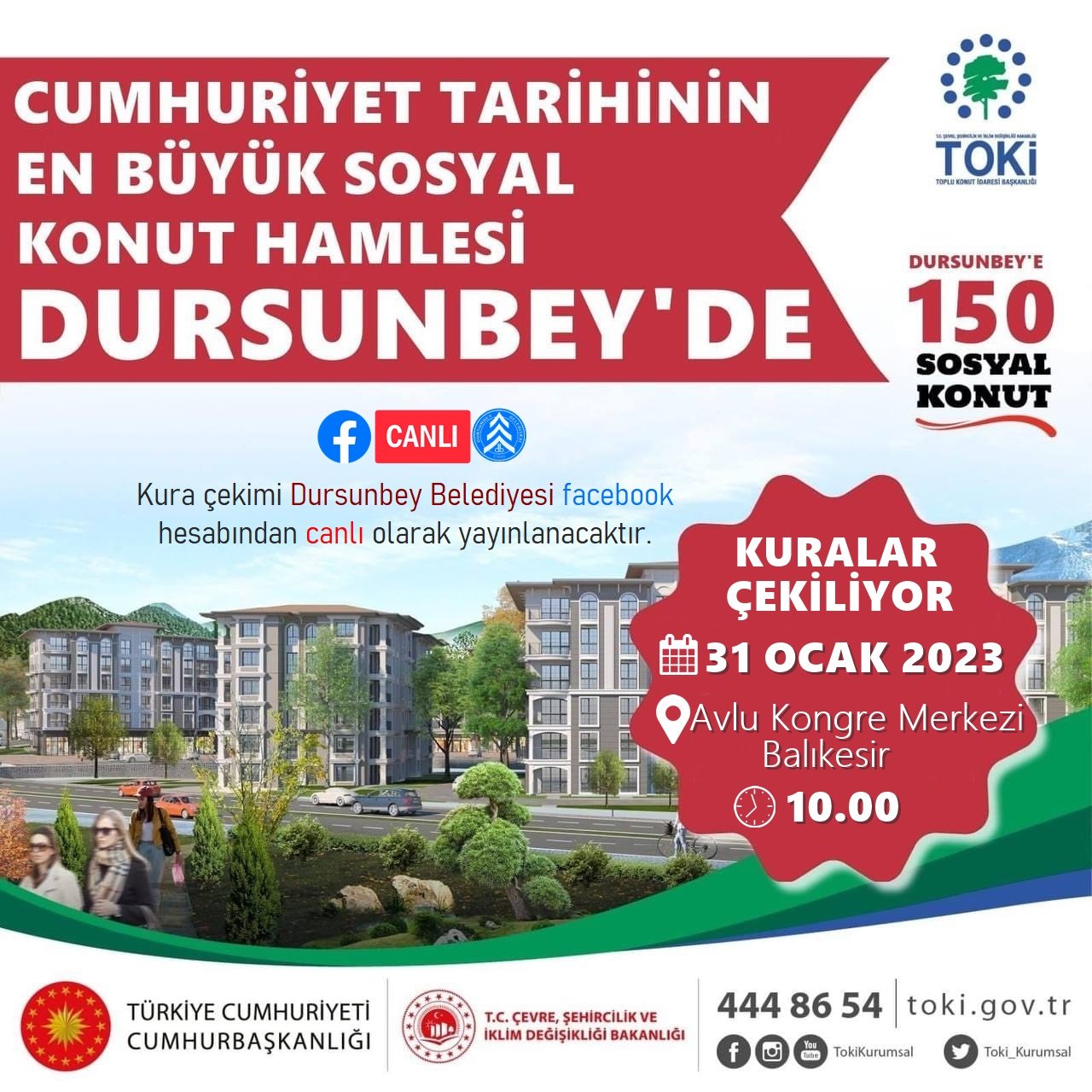Cumhuriyet tarihinin en büyük sosyal konut hamlesi; #YüzyılınKonutProjesi kapsamında, Dursunbey'de yapılacak olan 4. etap TOKİ konutlarının kuraları 31 Ocak 2023 Salı günü saat 10.00'da çekiliyor. Noter huzurunda gerçekleşecek olan kura çekimi, Balıkesir Avlu Kongre Merkezinde gerçekleşecek. Vatandaşlarımızın da katılabileceği kura çekimi Belediyemiz facebook sayfasından #canlı olarak yayınlanacak.