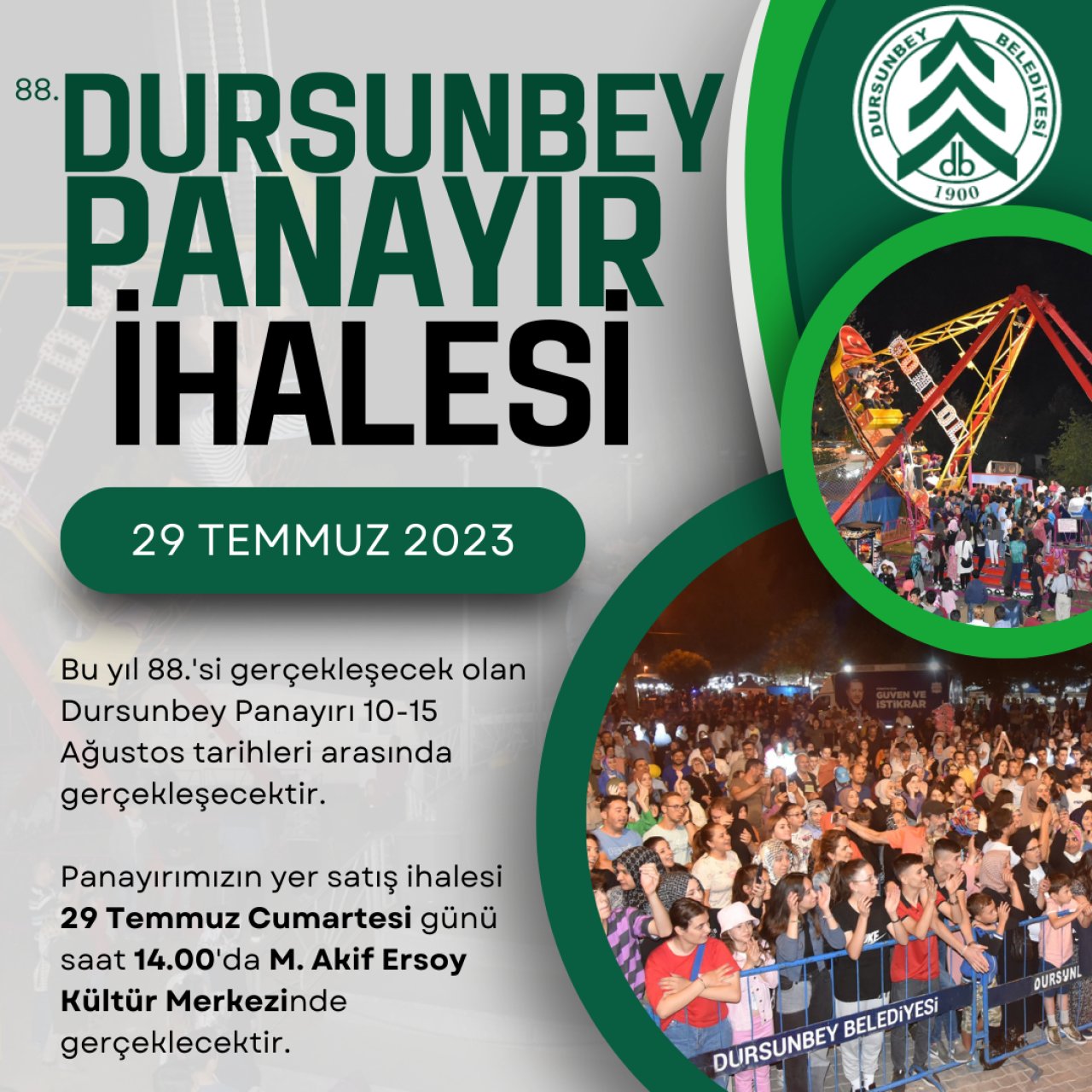 Dursunbey Panayırı bu yıl 10-15 Ağustos 2023 tarihleri arasında (6) gün süre ile Saz Mesire alanında gerçekleşecek. Panayırımızın yer satış ihalesi 29 Temmuz Cumartesi günü saat 14.00'da M. Akif Ersoy Kültür Merkezinde gerçekleşecektir...
