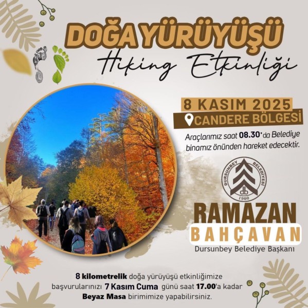 Dursunbey Belediyesi Kültür, Sanat ve Sosyal İşler Müdürlüğü tarafından organize edilen doğa yürüyüşlerinin 5. haftadaki konumu Candere Bölgesi olacak.Başvuru ve ayrıntılı bilgi için;Beyaz Masa0266 662 3 662