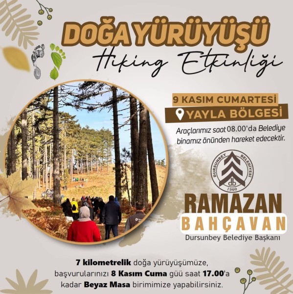 Doğa Yürüyüşlerimiz Başlıyor Dursunbey Belediyesi tarafından 9. su organize edilecek olan doğa yürüyüşleri 9 Kasım'da Yayla Bölgesinde başlıyor. Müracaat ve ayrıntılı bilgi için;