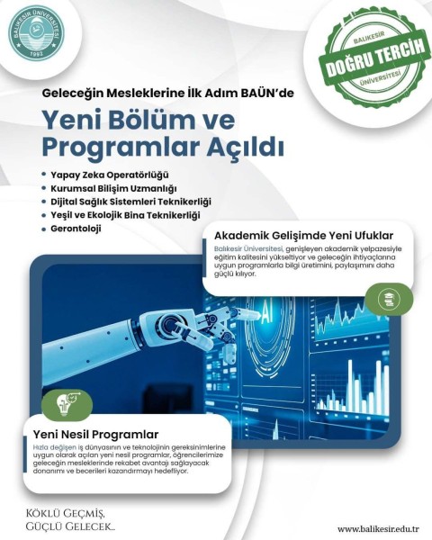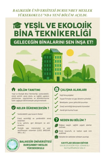 Dursunbey MYO’ da Eğitim Fırsatları Genişliyor Yeşil ve Ekolojik Bina Teknikerliği Programı Açıldı Balıkesir Üniversitesi Dursunbey Meslek Yüksekokulu, 2025-2026 eğitim-öğretim yılında yepyeni bir programla öğrenci kabulüne başlıyor: Yeşil ve Ekolojik Bina Teknikerliği Programı. Bu yenilikçi program, çevre dostu ve sürdürülebilir yapıların tasarımı ve inşası konusunda teknik bilgi ve beceriye sahip mezunlar yetiştirmeyi hedefliyor. Enerji verimliliği, doğayla uyum ve yeşil bina teknolojileri üzerine yoğunlaşan program, geleceğin yapı sektörü ihtiyaçlarına şimdiden cevap vermeye hazırlanıyor. Dursunbey MYO, halihazırda eğitim vermekte olduğu Ormancılık ve Orman Ürünleri, İş Sağlığı ve Güvenliği, İnşaat Teknolojisi ve Kuyumculuk ve Takı Tasarımı programlarıyla da meslekî eğitimde bölgesel ve ulusal ölçekte önemli bir yere sahip. Uygulamalı eğitimin ön planda tutulduğu bu programlar, alanlarında donanımlı ve iş gücü piyasasına hazır bireyler yetiştirmektedir. Programlar hakkında daha detaylı bilgi almak isteyen aday öğrenciler için DMYO bünyesinde bir Tanıtım ve Bilgilendirme Masası kuruldu. Tüm adayları okulu ziyaret etmeye, akademik kadro ile tanışmaya ve tercih sürecinde bilinçli adımlar atmaya davet ediyoruz.