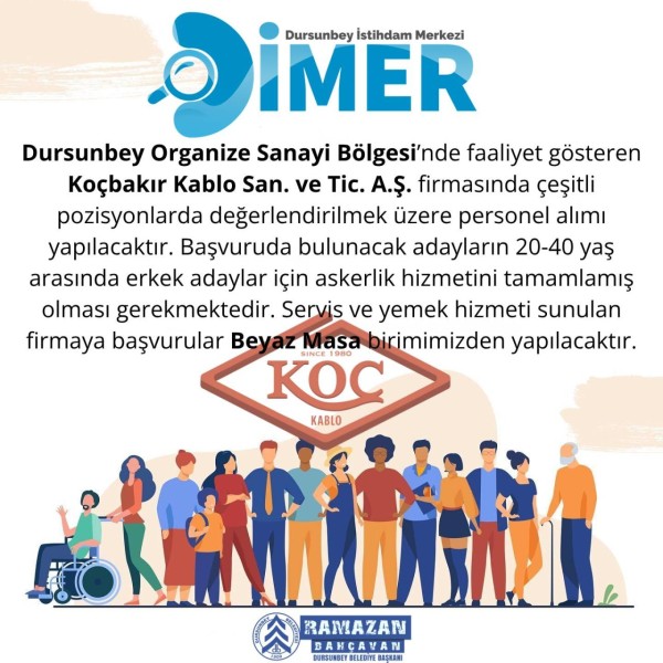 Dursunbey Organize Sanayi Bölgesi’nde faaliyet gösteren Koçbakır Kablo San. ve Tic. A.Ş. firmasında çeşitli pozisyonlarda değerlendirilmek üzere personel alımı yapılacaktır.