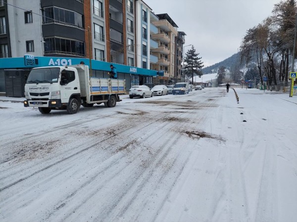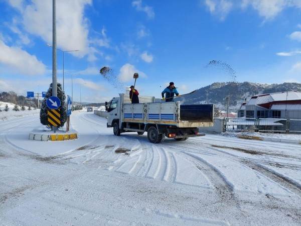 Kar yağışlarının etkili olduğu ilçemiz de buzlanma ve don olaylarına karşı yol tuzlama çalışmalarımıza ara vermeden devam ediyoruz.