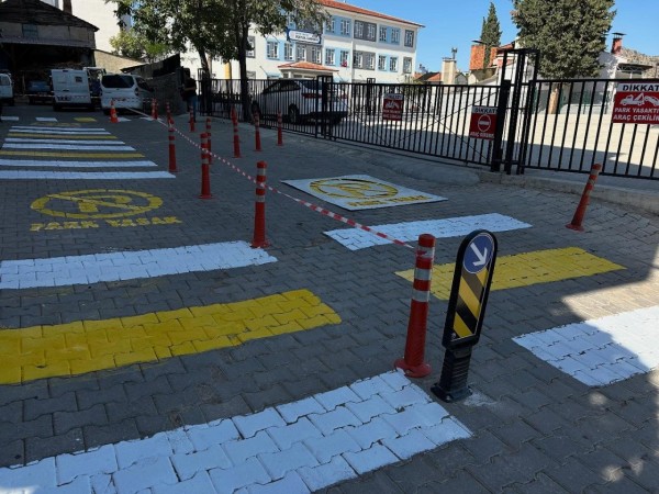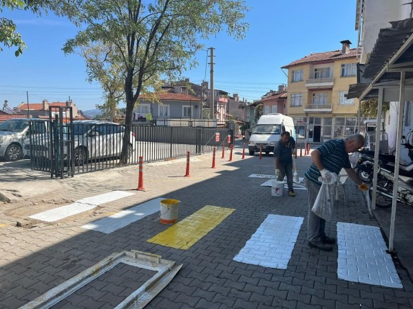 Zabıta Amirliği tarafından okul önlerinde yaya güvenliğini artırmak amacıyla yaya geçitleri daha görünür hale getirilerek sürücülerin dikkati arttırılıyor.